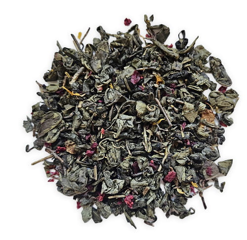 ✅ Składniki – herbata zielona (74%), kwiat hibiskusa, owoce żurawiny (5%), aromaty, skórka granatu (2,5%), liść poziomki, płatki nagietka