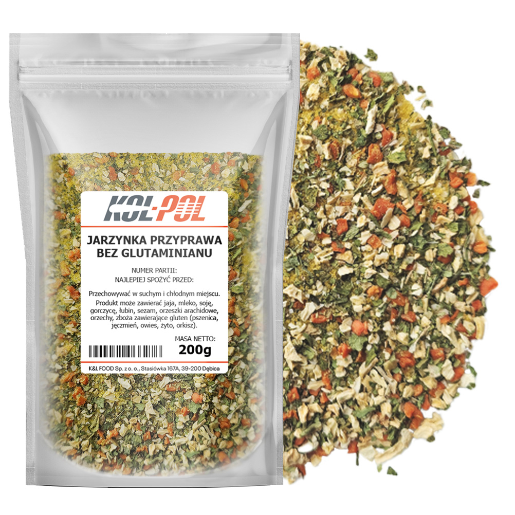 Jarzynka przyprawa bez glutaminianu to naturalna mieszanka suszonych warzyw i ziół, stworzona z myślą o codziennej kuchni. Idealna dla tych, którzy chcą przygotować aromatyczne dania bez użycia glutaminianu – jarzynka wzbogaca smak zup, sosów i potraw jednogarnkowych nutą suszonych warzyw i ziół. Naturalny skład i prostota użycia sprawiają, że to uniwersalne rozwiązanie w każdej kuchni!