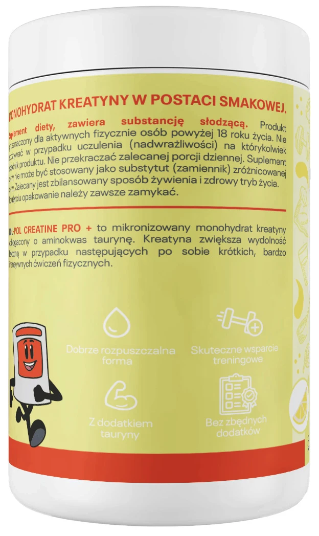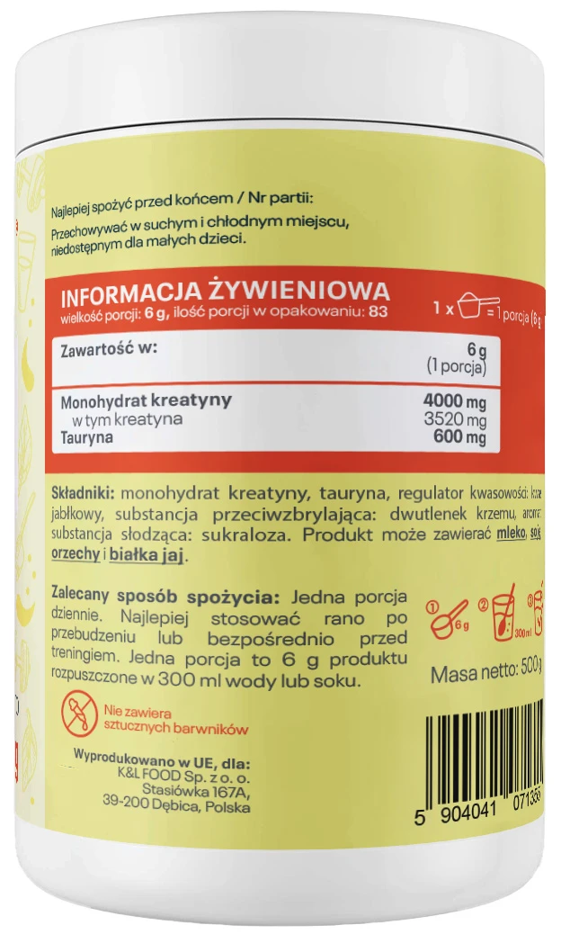 - Składniki monohydrat kreatyny, tauryna, regulator kwasowości: kwas jabłkowy, substancja przeciwzbrylająca: dwutlenek krzemu, aromat, substancja słodząca: sukraloza