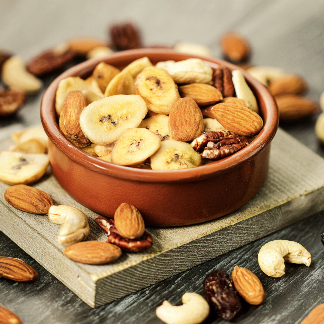 ✅ Składniki - orzeszki ziemne prażone (orzeszki ziemne 98%, olej rzepakowy), chipsy bananowe (banany 73%, olej kokosowy 17%, cukier 9,8%, naturalny aromat bananowy), rodzynki sułtańskie (rodzynki, olej słonecznikowy), rodzynki thompson, migdały łuskane, orzechy nerkowca, orzechy laskowe, orzechy włoskie.