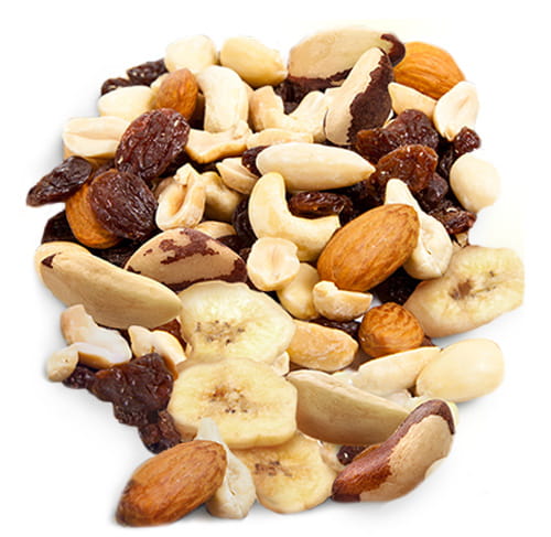 - Składniki orzeszki ziemne prażone (orzeszki ziemne 98%, olej rzepakowy), chipsy bananowe (banany 73%, olej kokosowy 17%, cukier 9,8%, naturalny aromat bananowy), rodzynki sułtańskie (rodzynki, olej słonecznikowy), rodzynki thompson, migdały łuskane, orzechy nerkowc