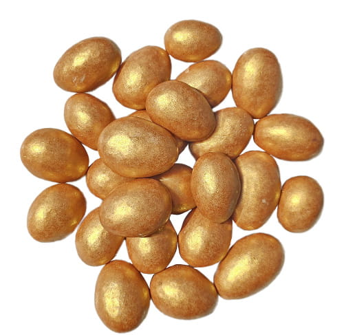 ✅ Połączenie luksusu i smaku – prażone migdały w aksamitnej mlecznej czekoladzie ze złotą posypką.