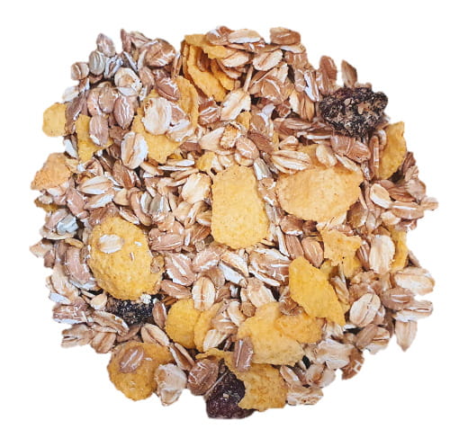 ✅ Wyselekcjonowana kompozycja składników – płatki owsiane, żytnie i kukurydziane wzbogacone orzechami i suszonymi owocami.