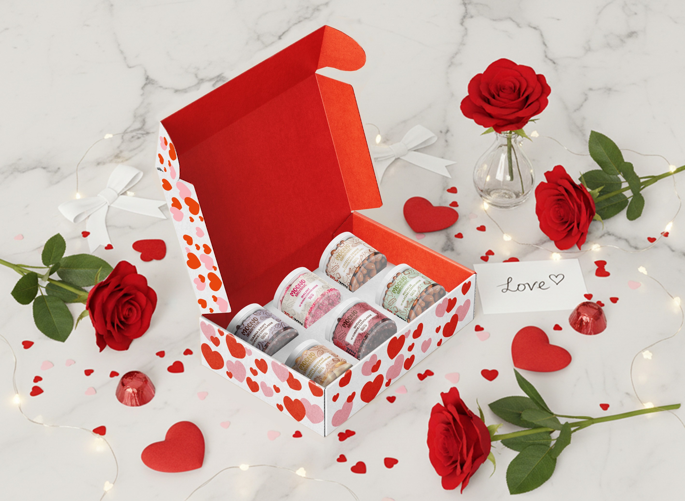 Podaruj ukochanej osobie wyjątkowy prezent, który łączy smak, jakość i piękne wykonanie. Ten ekskluzywny zestaw został skomponowany z 6 wyjątkowych, czekoladowych przysmaków zamkniętych w eleganckich słoikach. i zapakowanych w ozdobne pudełko „Dla mojej Walentynki”. Idealny jako prezent od serca na Walentynki.