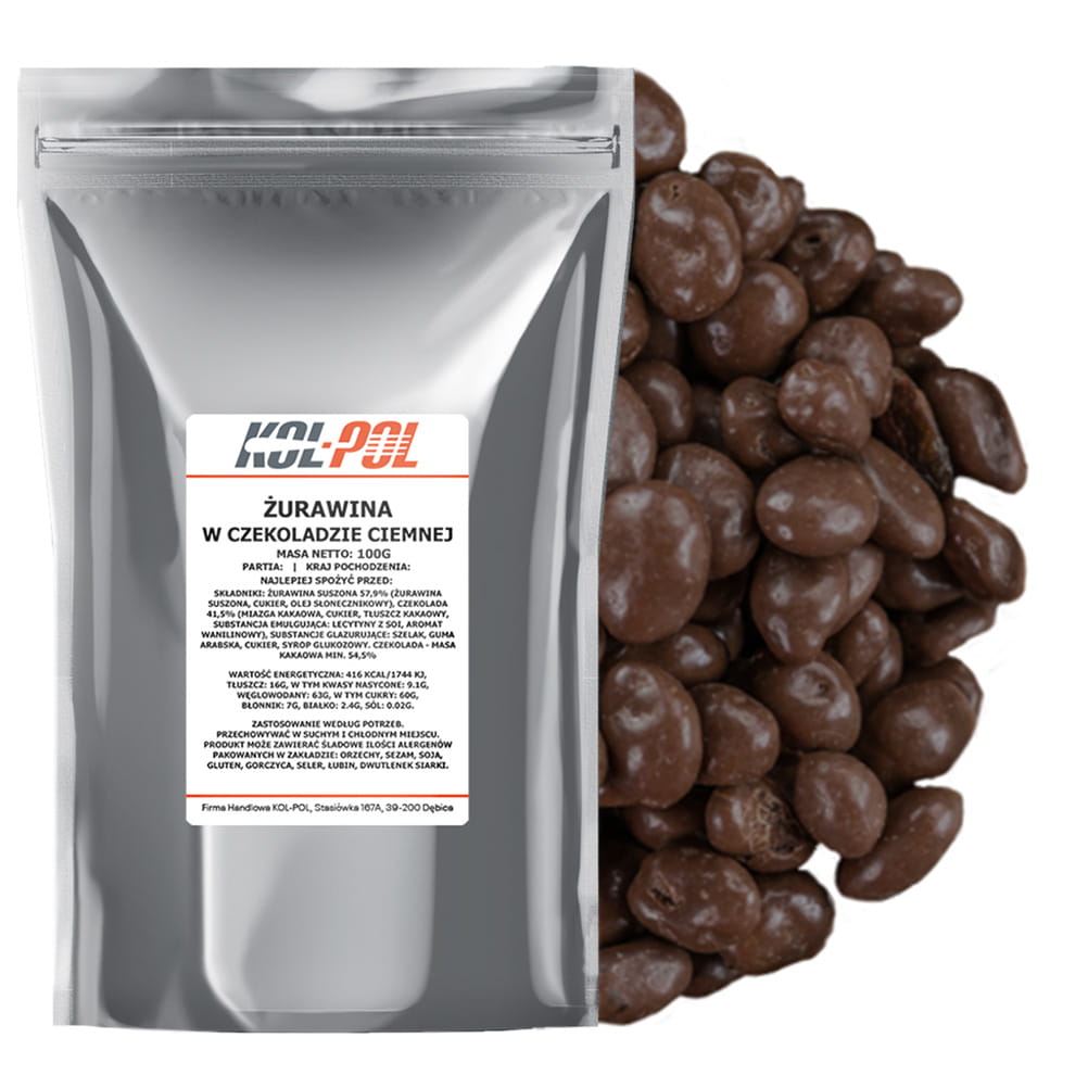 Żurawina w czekoladzie gorzkiej to pyszna i zdrowa przekąska, która łączy naturalną kwaskowatość suszonej żurawiny z głębokim smakiem czekolady. Idealne na każdą okazję – jako słodka przekąska, dodatek do deserów, czy miły upominek. Rozkoszuj się wyjątkowym połączeniem soczystej żurawiny i intensywnej czekolady gorzkiej.